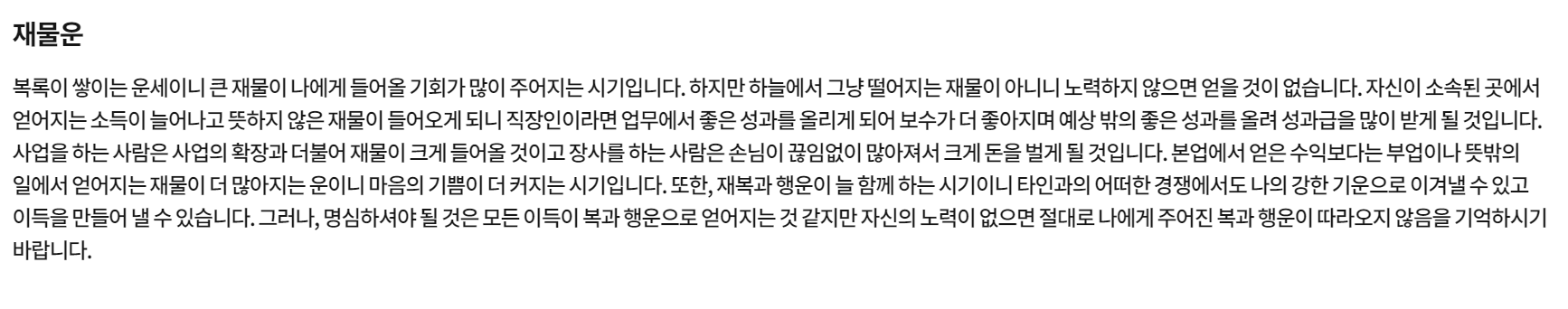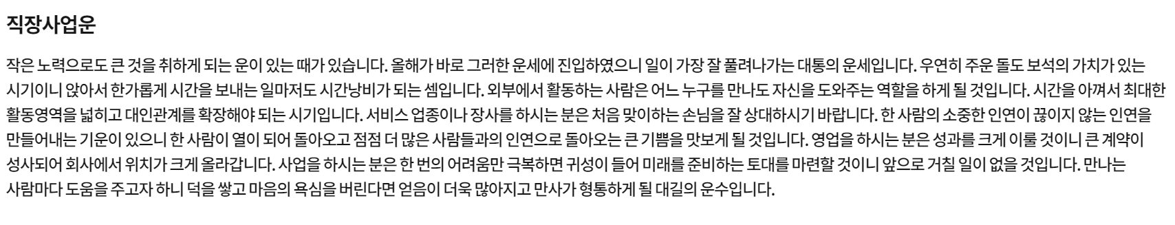 인터넷으로 사주풀이 운세를 찾아보면 느끼지만 정말로 많습니다. 이런 류의 컨텐츠를 제공하는 금융회사들이 너무 많아요. 대형 커뮤니티 사이트에서도 이용할 수 있구요. 그럼에도 불구하고 유독 이쪽을 고집하는 이유는 그곳보다 내용이 2~3줄은 더 많다는 점입니다.