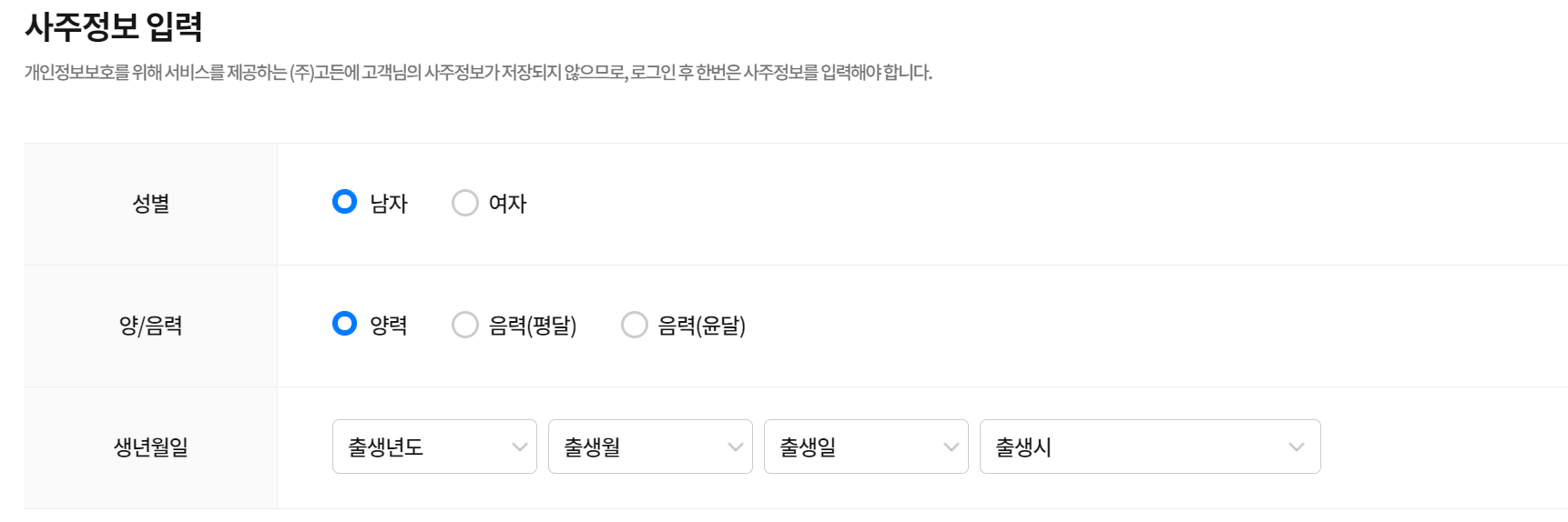 성별과 양력인지 음력인지를 체크하고 생년월일과 출생일 및 출생시간까지 선택합니다. 사주를 보신분들은 아시겠지만 단순히 태어난 날만 넣으면 안되거든요. 시간까지도 정확하게 알아야 합니다. 모르면 부모님께 여쭤보시구요.