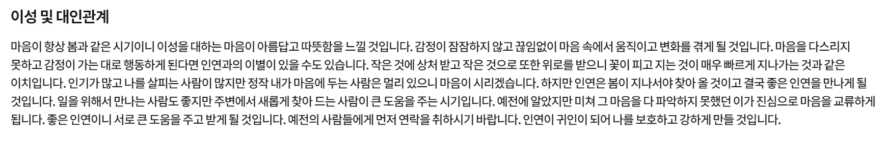 10~30대라면 가장 궁금한게 이성 및 대인관계에 대한 이야기겠죠. 감정이 잠잠하지 않고 끊임없이 마음 속에서 움직이는 변화를 겪게 된다고 합니다. 마음을 다스리지 못하고 감정이 가는대로 행동하지 말라고 하네요. 등잔 밑이 어둡다고 근처에 있는 사람에게 고백하고 사귀라는 말을 하네요.