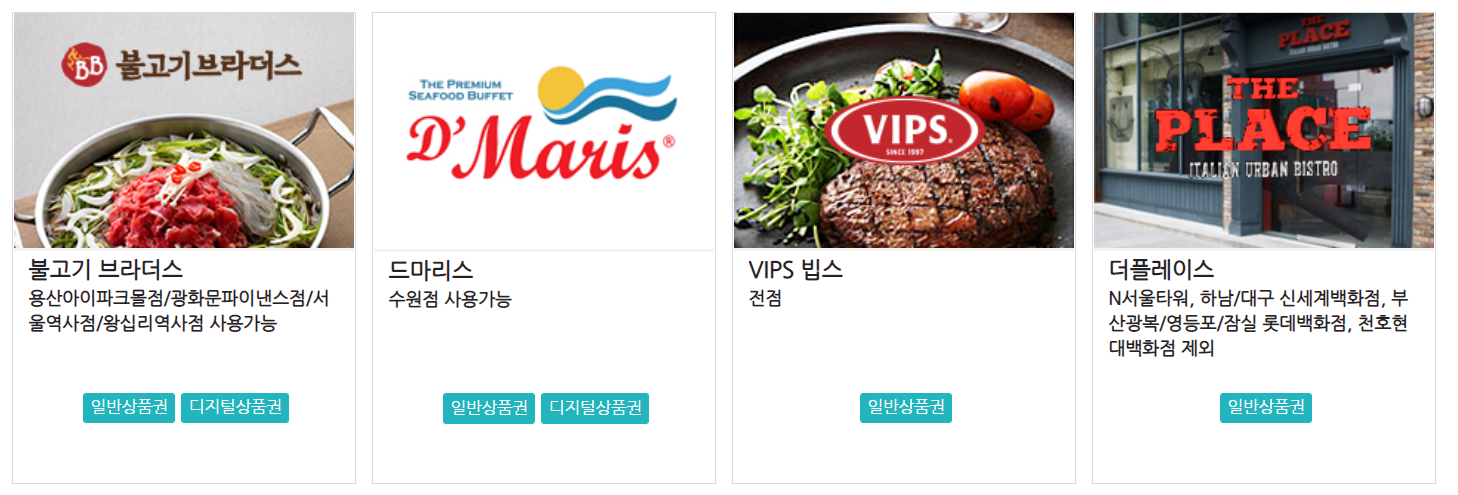 제가 사랑해마지않는 불고기 브라더스랑 드마리스 그리고 VIPS가 나와있습니다. 더플레이스는 제가 가본 기억이 가물가물 하네요. 해산물이 땡기거나 고기로 몸보신 좀 하고 싶을때 사용하면 좋을 것 같습니다. 가족들이랑 주말에 제대로 외식하기 딱이겠네요.