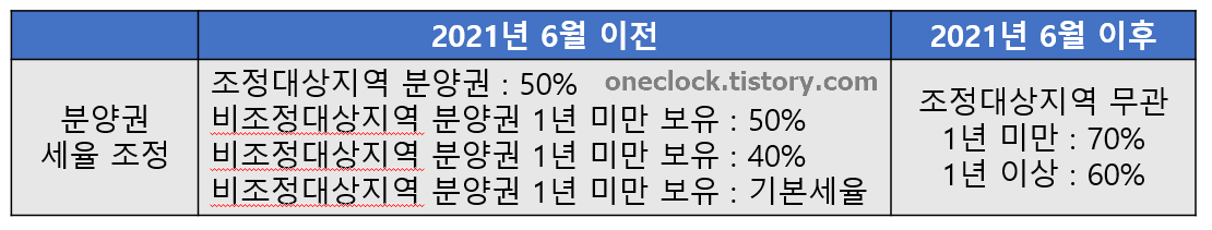 거듭 말씀드리지만 개인이 갖고있는 분양권도 공통 적용되는 사항입니다. 예를 들어서 2년 이상 가지고 있었던 분양권을 2021년 6월 1일 이후에 양도한다고 치면 2년 이상 보유를 했더라도 60%의 세율을 적용받습니다.