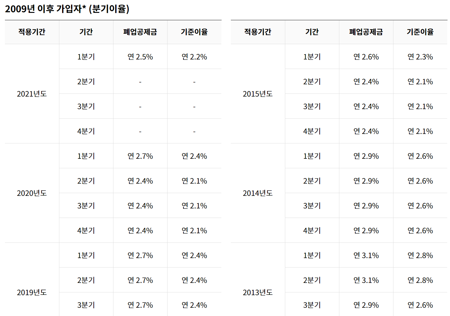 폐업공제금은 연 2.5%이고 기준은 연 2.2%입니다. 연간과 분기마다 정해진 내역은 표로 확인바랍니다. 제로금리 시대에 나쁘지 않습니다. 이것보다 더 훌륭하면 좋겠지만 그게 아니라도 나의 뒷배가 되어줄 든든한 목돈마련식 적금통장 하나가 알아서 복리로 늘어난다는건 반길만한 일입니다.