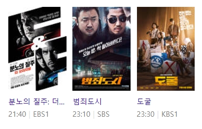 EBS1 채널은 분노의 질주 더 오리지널, SBS는 범죄도시, KBS1 채널은 도굴을 방영 합니다. 현재까지 3개 영화만 방영 일정이 나왔습니다. 많은 분들이 이미 봤을 법한 영화들 입니다. 또다른 채널의 티비영화 방영시간이 궁금하면 이쪽을 참고 바랍니다.
