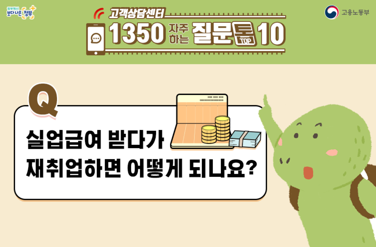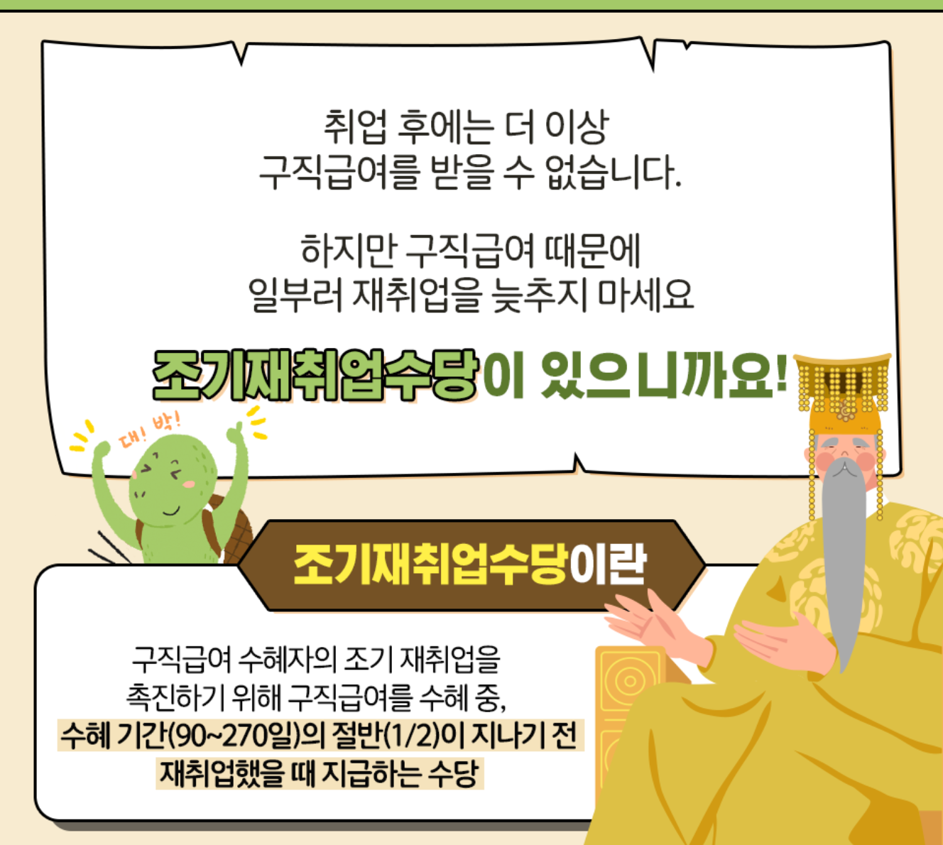 취업 후에는 더이상 구직급여를 받을 수 없습니다. 하지만 그렇다고 일부러 취업에 대한 기회를 놓칠 필요는 없습니다. 조기재취업수당을 따로 챙겨주기 때문입니다. 수혜기간 (90~27일)의 절반(1/2)이 지나기전 재취업했을 때 수당을 지급하는 노동부의 권고정책입니다.