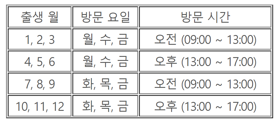 신규로 실업급여를 신청하실분들은 아래 출생월에 따른 방문시간을 확인부탁드립니다. 코로나19로 인해서 2023년도 방문요일과 시간을 명확히 정해두고 해당되는 분들만 받고 있습니다.