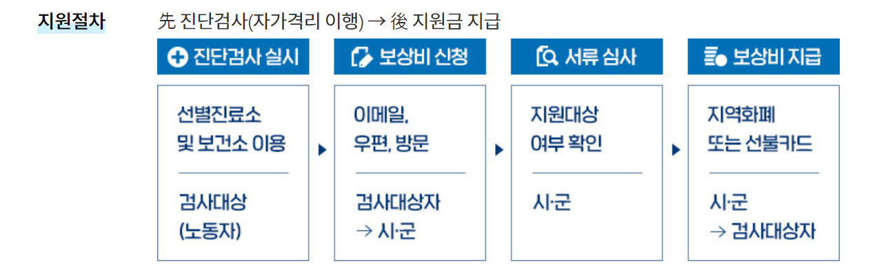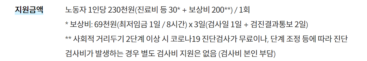 - 보상비 : 6만 9천원(최저임금 1일 / 8시간) x 3일 (검사일 1일 + 검진결과통보 2일)