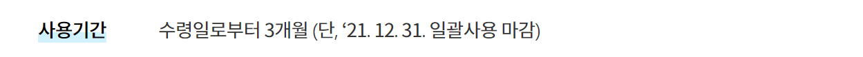 수령일로부터 3개월 이내에 써야합니다. 6개월까지 사용할 수 있을 줄 알았지만 삼개월이 한계네요. 받으면 그달에 까먹지말고 다 쓰는게 나을 것 같습니다.