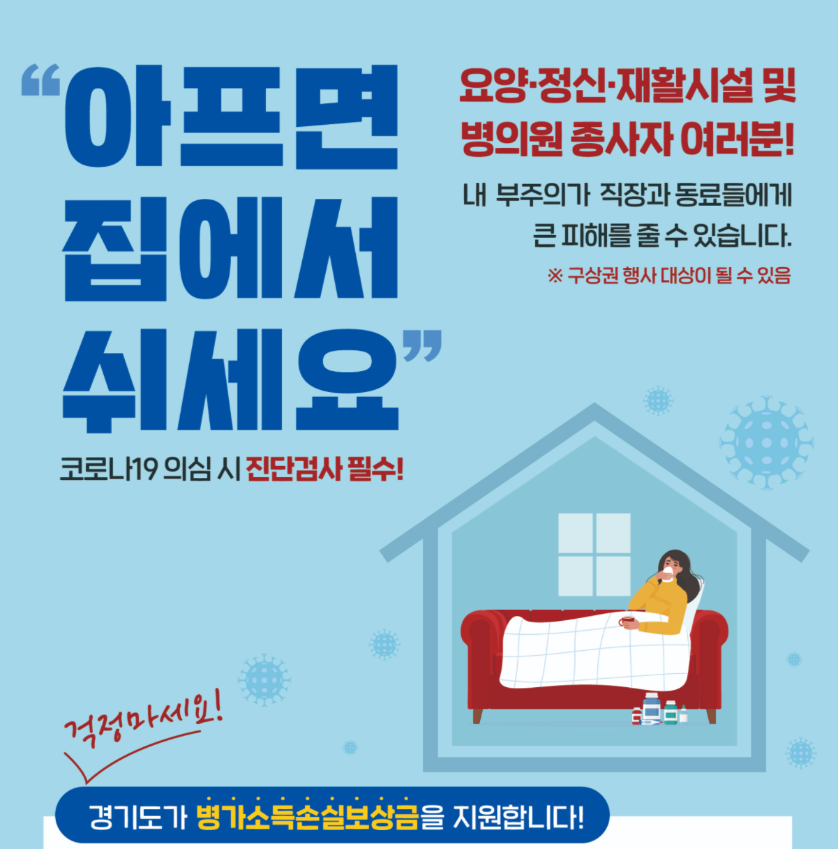 2021년도 부터는 코로나19 조기 진단검사를 위한 병가 소득손실보상금을 지원합니다. 아파도 쉬지 못하고 눈치만 보는 수많은 이들을 위로하는 정책 중 하나입니다. 너도나도 2주간 일을 쉬게되면 누가 내 일을 대신해줄까요? 유급으로 쉴 수도 없는 처지라면 집에 있는게 곤욕이지만 올해부터는 눈치 안보고 쉴 수 있게 해드립니다.
