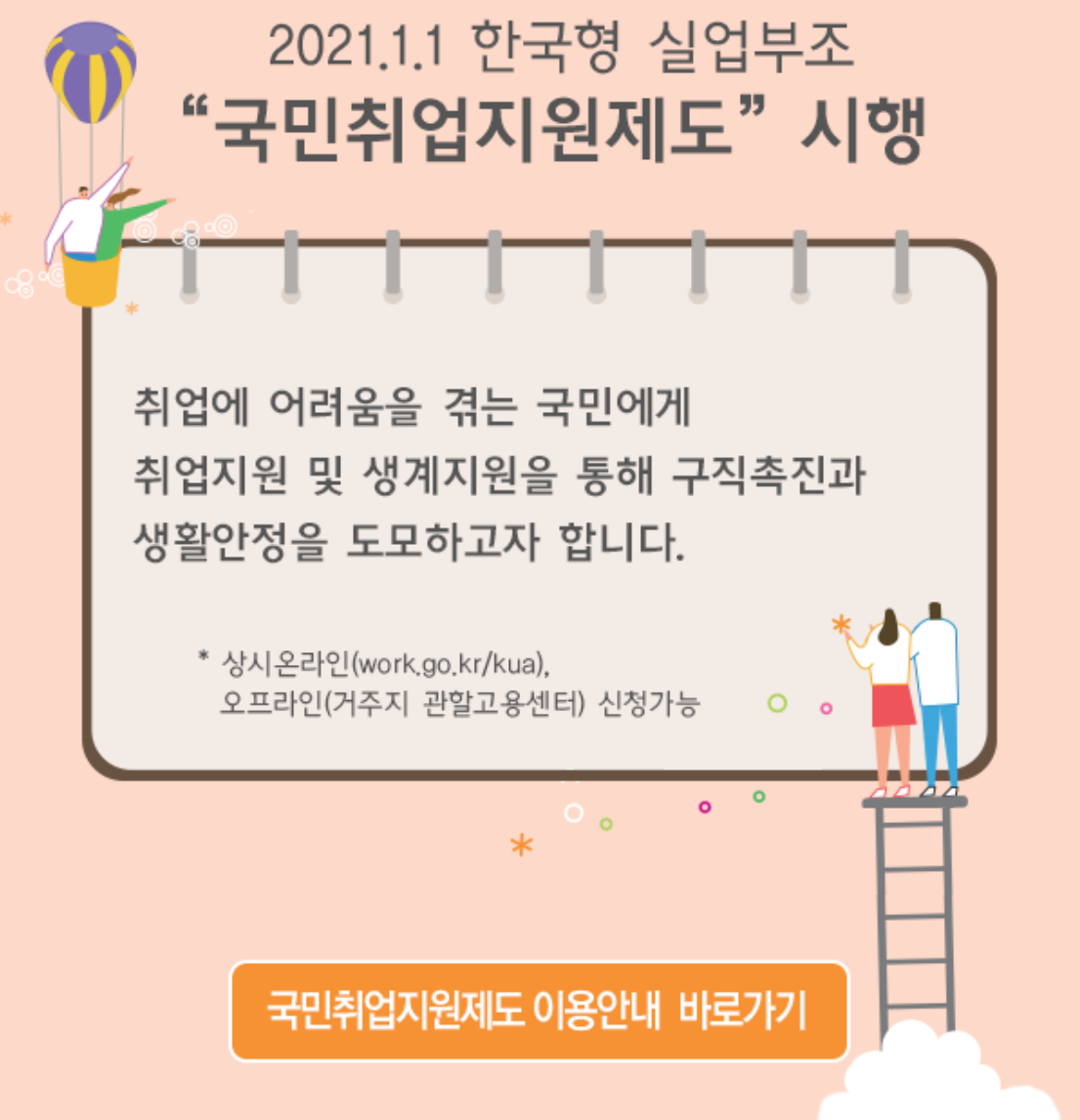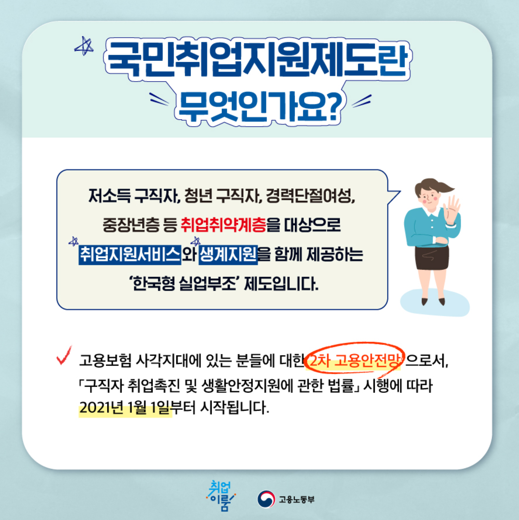 국민취업지원제도 실업급여 관계가 많이 궁금들 하시죠? 그렇다면 지금부터 본문을 통해서 바로 해결해보세요 한국형 실업부조 정책으로 2021년 1월 1일부로 시행 국민취업제도는 이렇습니다 국
