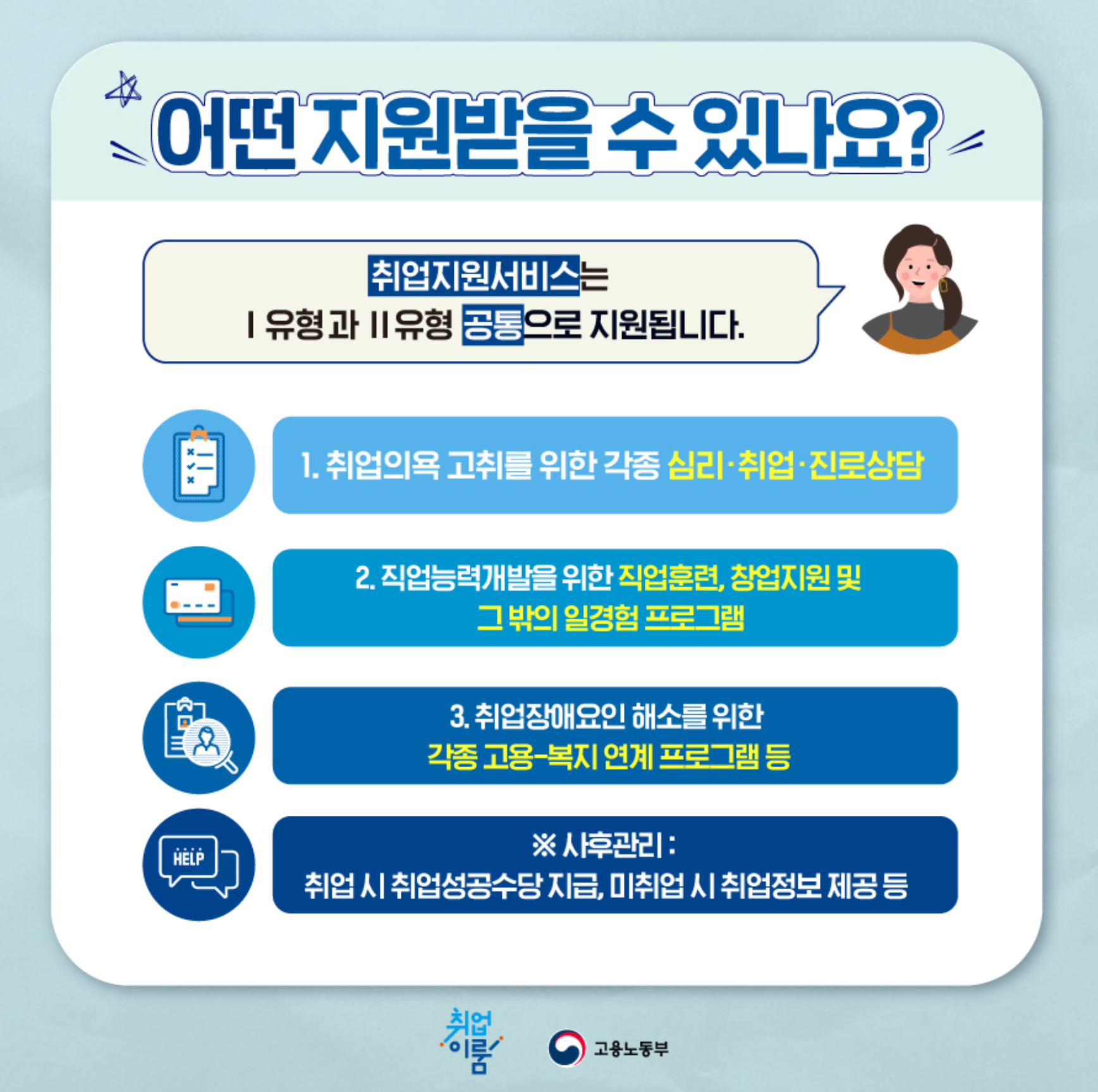 1유형과 2유형 참가자 모두에게 취업지원 서비스를 고르게 지원합니다. 참여하는 사람과 고용센터 담당자가 연결되서 심층상담하고 서로간 협의를 하면서 개인별 취업의 어려움과 취업능력에 따라 관련계획을 수립하고 필요한 직업훈련 및 일경험과 복지서비스를 연결시켜주기도 합니다.
