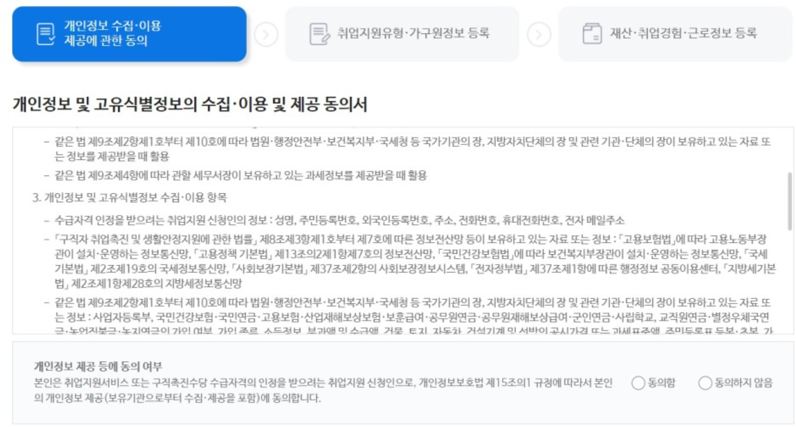 녹색배경의 '참여신청'을 눌러서 개인정보 동의하고 취업지원유형 가구원 정보를 등록합니다.