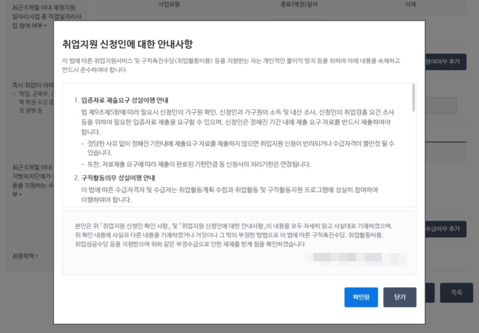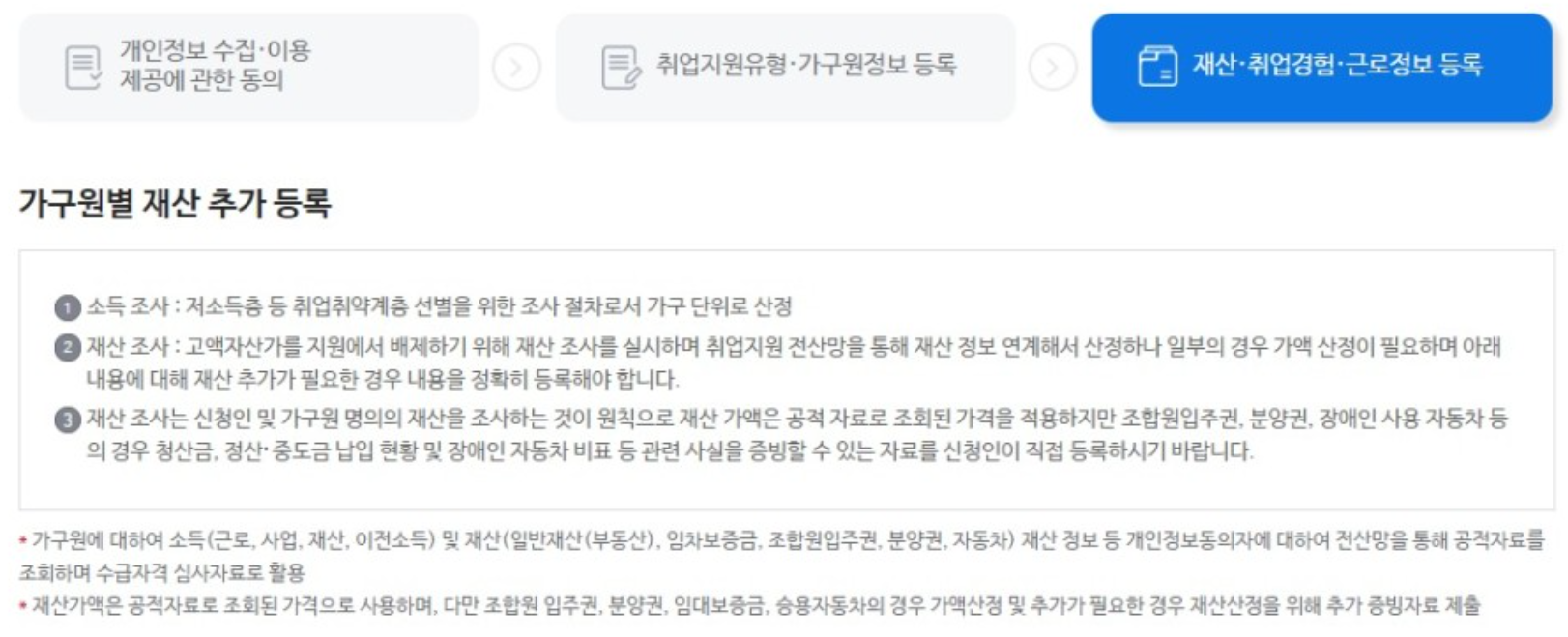 재산,취업경험,근로정보를 등록합니다. 글자가 많아서 어지러워 보이지만 자세히보면 그다지 어려운 내용은 아니란걸 알 수 있습니다. 질문하는 내용에 그대로 답변하면 되는 수준입니다.