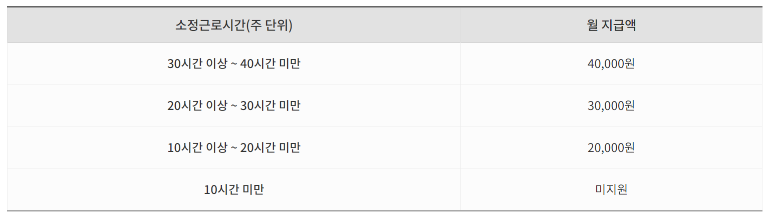 5인미만 사업체는 1인당 월 7만원까지 지급하며 5인 이상이라면 1인당 월 5만원까지 드립니다. 단시간 및 일용노동자는 근로시간 및 근로일수를 계산한 다음 드립니다.