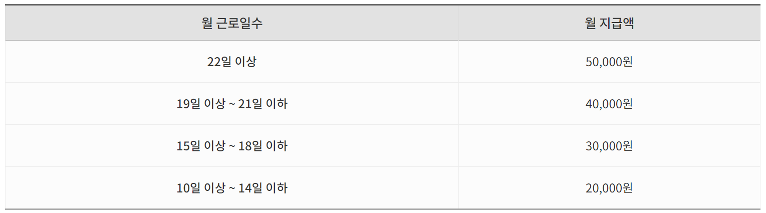 월 중 입사하거나 퇴사 또는 휴직한 경우라면 근무일수에 비례해서 지급합니다. 엄청나게 많이 주는건 아니지만 못받는 사람들보다는 받을 수 있는 자격이 있을때 받는게 훨씬 이득입니다. 필요한 서류는 아래 첨부하니 잘 출력해서 내용작성 후 근로복지공단 지사에 제출바랍니다.