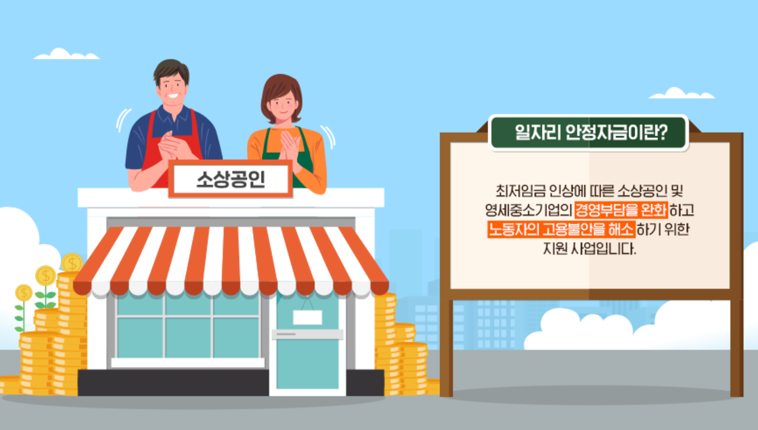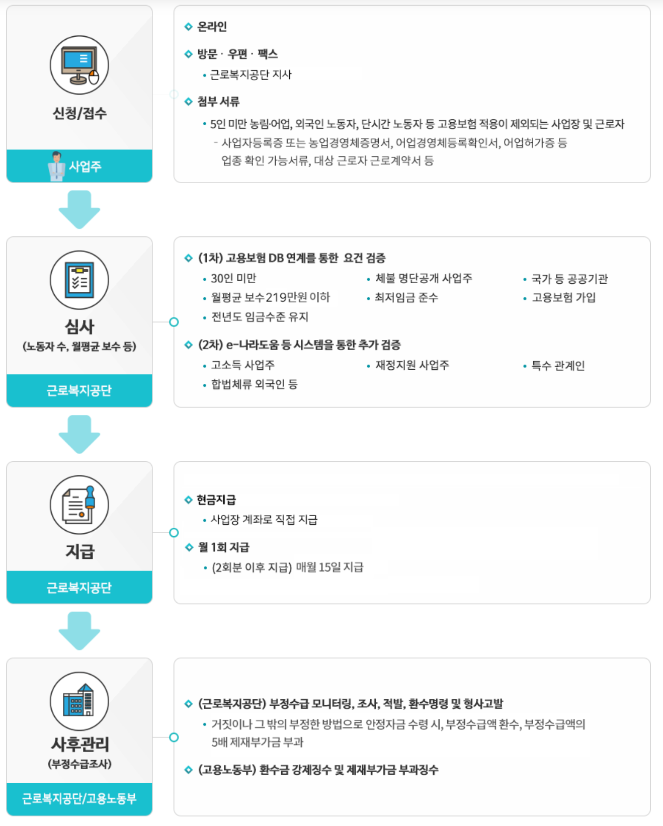 최저임금 상승에 따른 소상공인과 중소기업의 경영부담을 완화하고 근로자의 고용불안을 해소하고자 월 평균보수 219만원 이하 노동자에게 매월 돈을 지급합니다. 신청하는 순으로 먼저 드리며 1번 신청으로 일년 내내 알아서 드립니다.