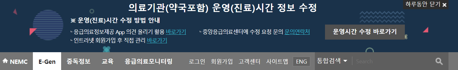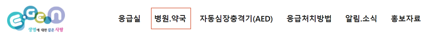 중앙응급의료센터에 오신걸 환영합니다. 전국 모든 의료데이터를 취합해서 한번에 송출해주는 역할을 하는 곳입니다. 윗쪽에 달려있는 메뉴 중 왼쪽 2번째 항목을 눌러봅니다.