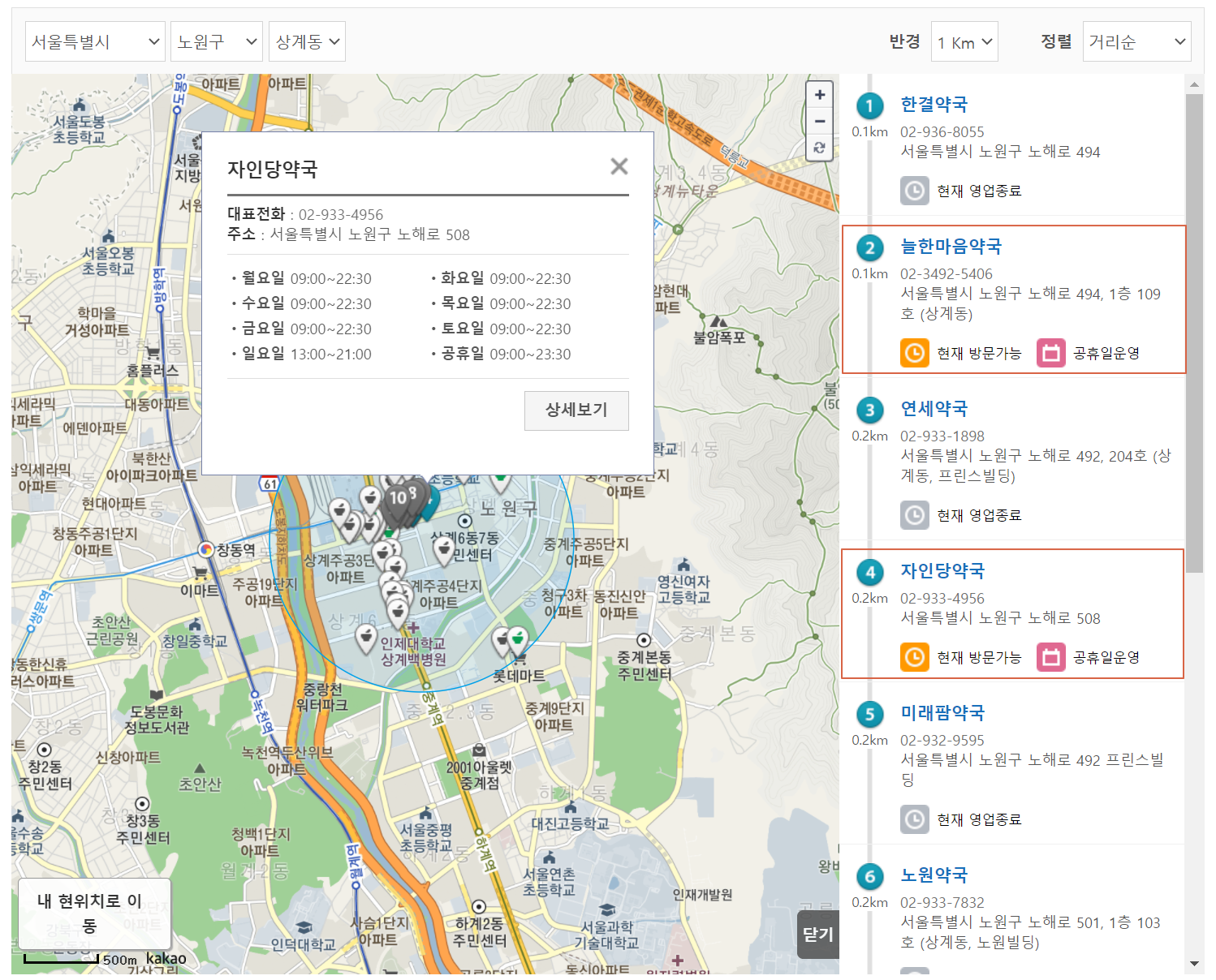 내가 현재 있는 위치에서 가까운 곳부터 찾고싶다면 반경은 기본 세팅인 '1km'를 그대로 유지하시길 바랍니다.