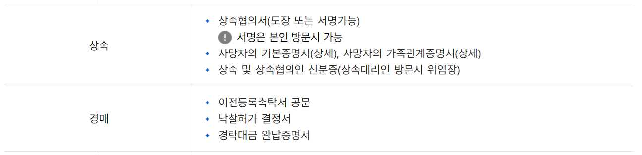 상속시 : 상속협의서, 사망자의 기본증명서, 상속 및 상속협의인 신분증