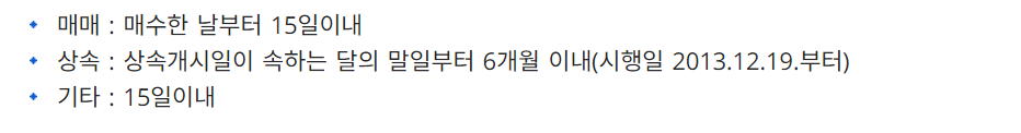 매수한 날로부터 15일 이내로 양수인은 이전등록 신청을 마무리 해야합니다. 상속을 받았다면 달의 말일부터 6개월 이내로 해야하고 다른 상황이라면 15일 이내로 처리를 해야하며 이를 무시할 경우에는 50만원 이하의 과태료(범칙금)이 부과되니 주의바랍니다.