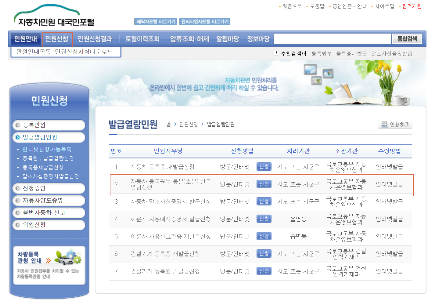 자동차민원 대국민포털이란 곳이 있습니다. 이곳으로 들어가서 민원신청 > 발급열람민원의 항목을 찾아보면 내 차가 됐는지 아닌지를 마지막으로 최종 점검할 수 있습니다.