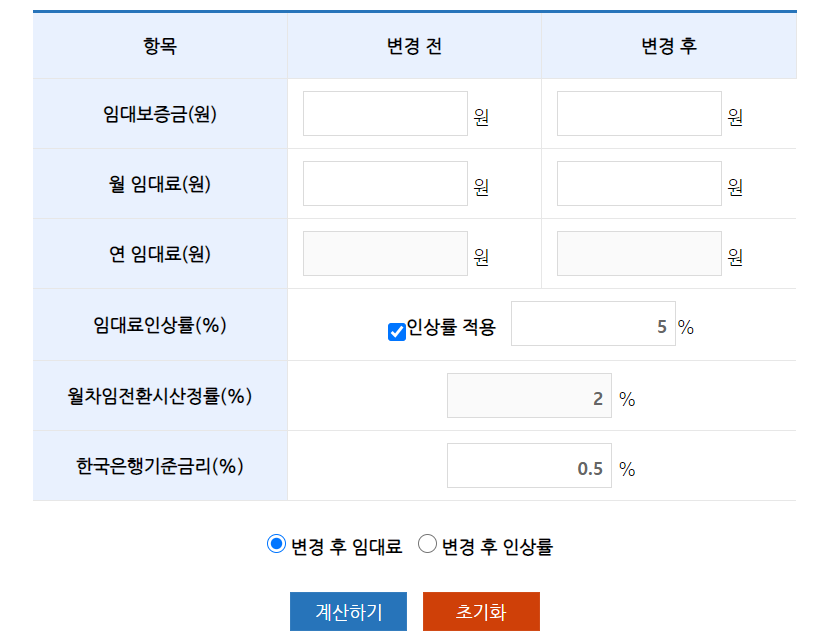 본인이 거주하고 있는 아파트나 빌라 등의 전세 보증금을 월세로 전환할 경우에는 위 화면에서 현재의 임대보증금과 변경후 임대보증금을 입력하면 자동으로 월임대료 값이 자동으로 계산되어 나오는걸 알 수 있습니다.