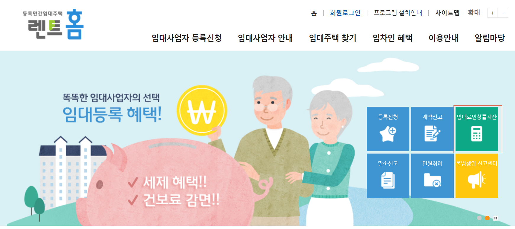 민간임대주택 민원처리 서비스인 렌트홈에서는 임대료 인상률을 자동으로 계산해주는 온라인 프로그램을 그냥 제공해주고 있습니다. 따로 불편한 절차를 거칠 필요도 없으니 다음과 같이 해보시길 바랍니다.