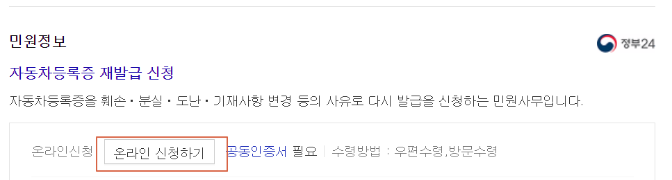 제가 위에 명시한 대로 찾아보면 정부24가 아랫쪽에 나오게 됩니다. 여기서 온라인 신청하기로 들어갑니다.