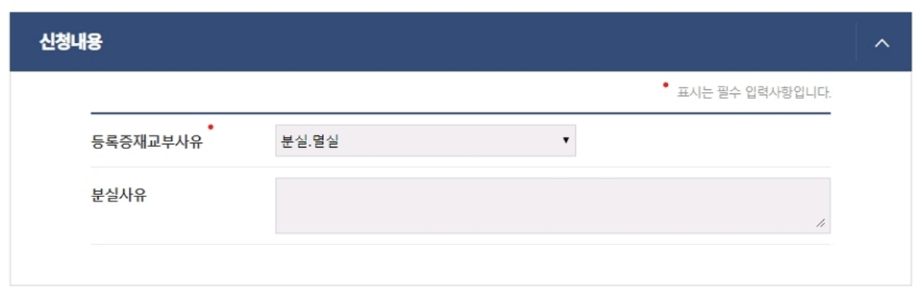 4. 등록증 재교부 사유란이 있습니다. 분실과 멸실로 체크된 상황에서 분실하게 된 경위만 상세하게 작성하면 됩니다. 예를 들자면 "술을 마시다가 하수구에 빠뜨리게 됐습니다." 처럼 말이죠. 내용을 보고 자격박탈을 하는건 아니므로 크게 부담을 느낄 필요는 없습니다.