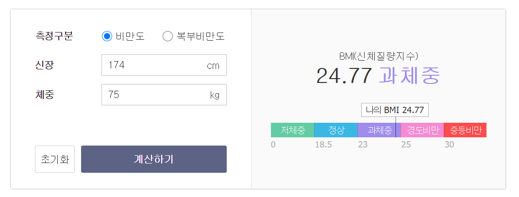 다음에서 이렇게 검색하면 바로 나옵니다. 첫번째 위치에 나오고 사용방법 또한 워낙 직관적이라 별다른 설명이 따로 필요없을 정도입니다. 현재 내 키를 기준으로 얼만큼 뚱뚱한지 알아보려면 신장 174cm를 적고 체중 75kg를 적어봅니다. BMI (신체질량지수)가 24.77로 과체중 표기가 나옵니다.