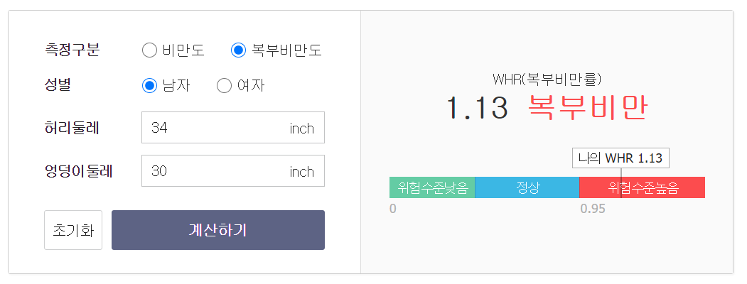 이번에는 여세를 몰아 복부미만도 항목으로 변경해서 두번째 체크를 해봅니다. 성별은 남성으로 두고 허리둘레 34inch에 엉덩이 둘레 30inch로 잡았습니다. WHR(복부비만률)이 1.13으로 위험수준이 높다고 나오네요.