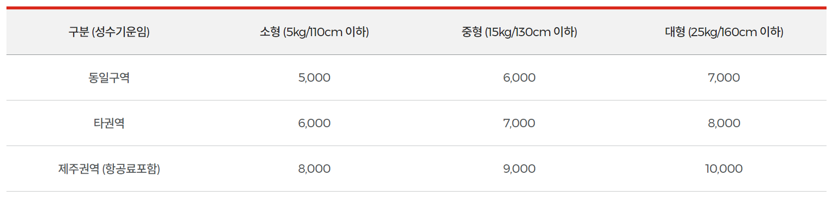 소형,중형,대형 운임비