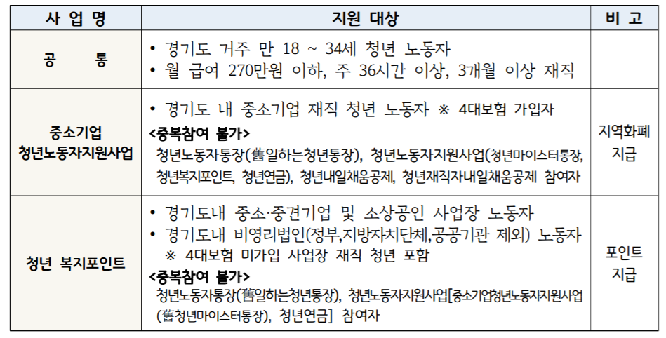 청년 중소기업 노동자 지원사업 중 일환으로 경기도에 거주하는 만 18세~34세 청년 근로자를 위한 정책을 펼칩니다. 가구 중위소득 100% 이하인분들이 대상이긴 하나 생각보다 많은분들이 혜택을 보고 있습니다. 총 5천여명을 대상으로 하며 인원이 차면 금방 끝날 수 있으니 서두르시길 바랍니다.