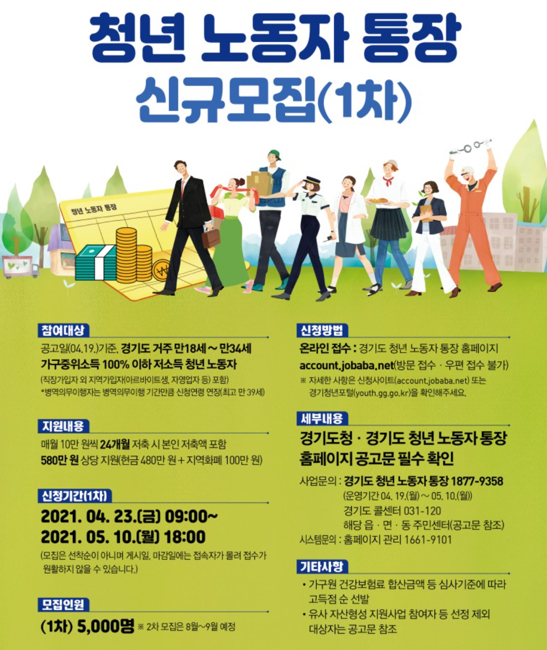 이건 우리가 흔히 말하는 청년 근로자 통장을 말합니다. 매년마다 1차,2차 이렇게 나눠서 모집을 하곤 하죠. 작년에도 했고 올해도 어김없이 시행합니다. 지원하는 내용은 매월 10만원씩 24개월을 저축하게 되면 본인 저축액을 포함해서 580만원이 돌아옵니다.