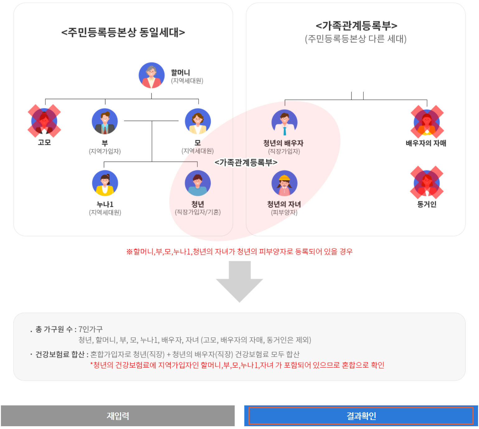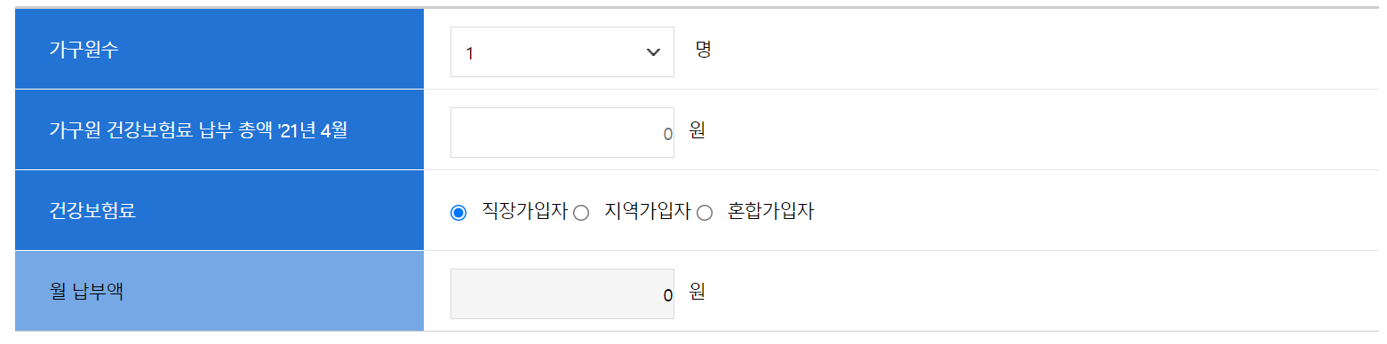 윗쪽에 올려놓은 청년 누리집으로 방문하면 본인이 대상자인지 아닌지 조회할 수 있는 시스템도 있습니다. 가구원수별 어느정도 건강료를 납부하는지에 따라 해당여부가 갈리게 됩니다.