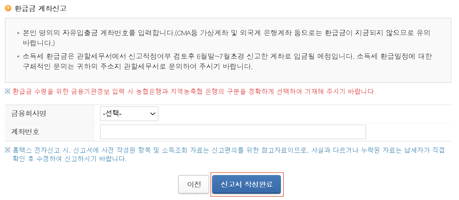 15. 환급받을 수 있는 분들은 통장계좌를 남겨주고 작성완료를 눌러주면 됩니다.
