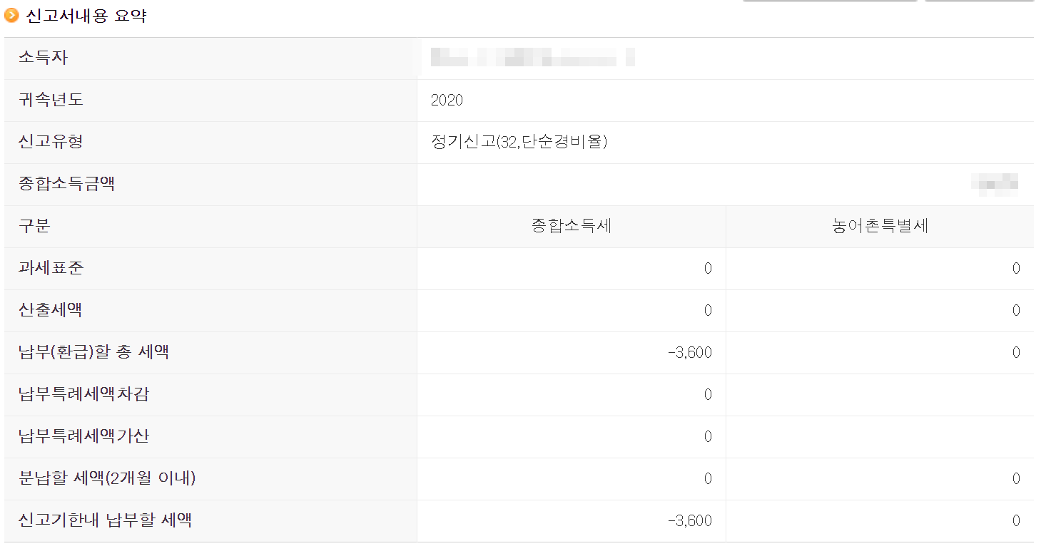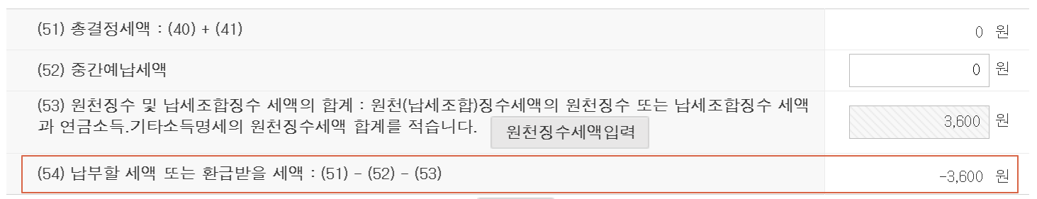 13. 저의 경우에는 -3,600원이 나왔네요. 마이너스 금액이라 환급대상 입니다. 슬프네요. 세금을 내더라도 뭐 하나라도 잘 됐으면 좋았으련만 능력 부족을 여실히 느낍니다.