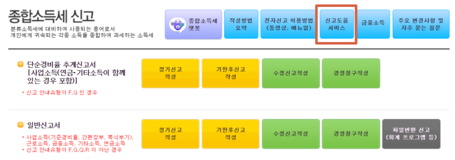 2. 빨간 네모박스로 표시한 곳의 '신고도움서비스'를 눌러주세요. 제가 모바일에서 진행하기 힘들었던 이유 중 하나인데요. 조그마한 화면에서는 필요한 메뉴가 어디쪽에 있는지 찾기가 어렵더군요.