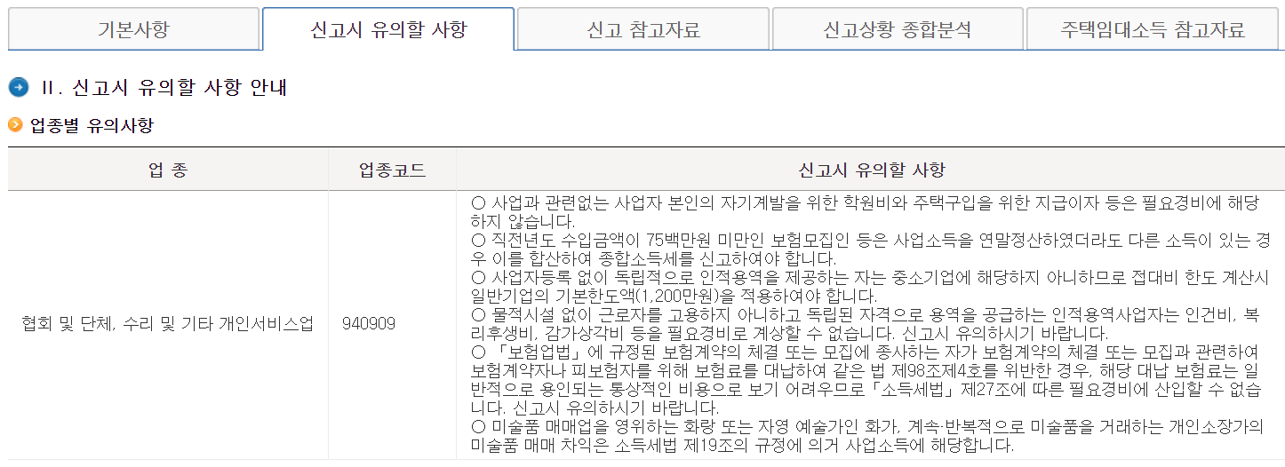 3. 직장인, 프리랜서, 유튜버 종합소득세 신고를 하거나 개인사업자 중 수익이 적은 분들은 저처럼 신고안내유형이 없음으로 나오는 경우가 있습니다. 이럴때는 당황하지 마시고 본인이 E 아니면 F 유형이라고 생각하면 됩니다. 추계신고시 단순경비율을 적용하는 분들이며 위 화면은 캡쳐를 해놓던지 메모장에 적어두세요.