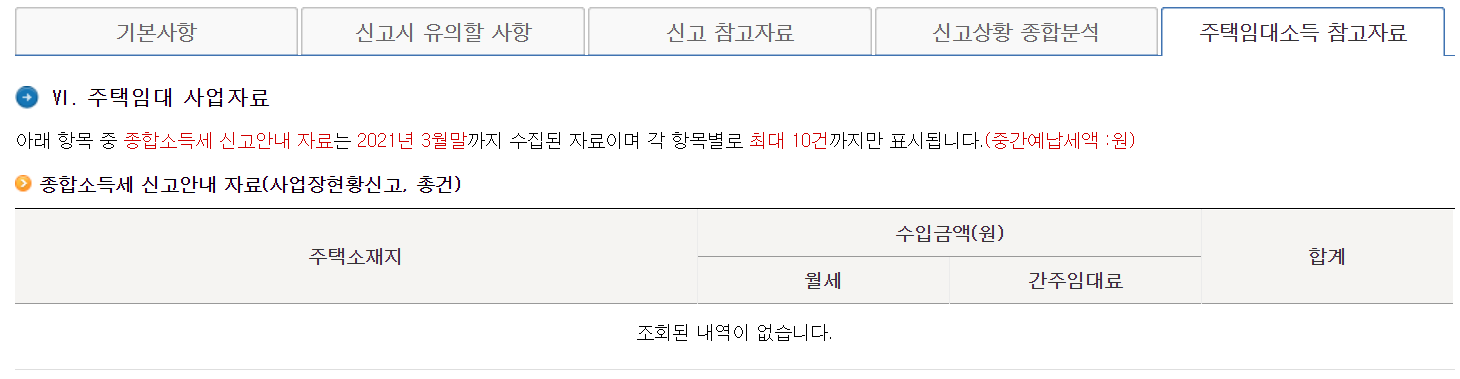 7. 주택임대소득 참고자료의 경우는 말그대로 아파트나 빌라 또는 연립주택 등 물건을 갖고있어서 그걸 돌려서 세입자를 받고 월세든 수익을 매달 올릴 경우에 해당됩니다. 저처럼 그런게 없는 분들은 조회된 내역이 없다고 나옵니다.