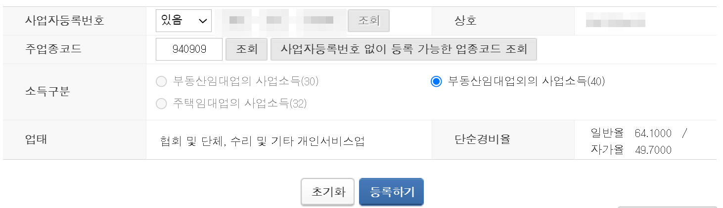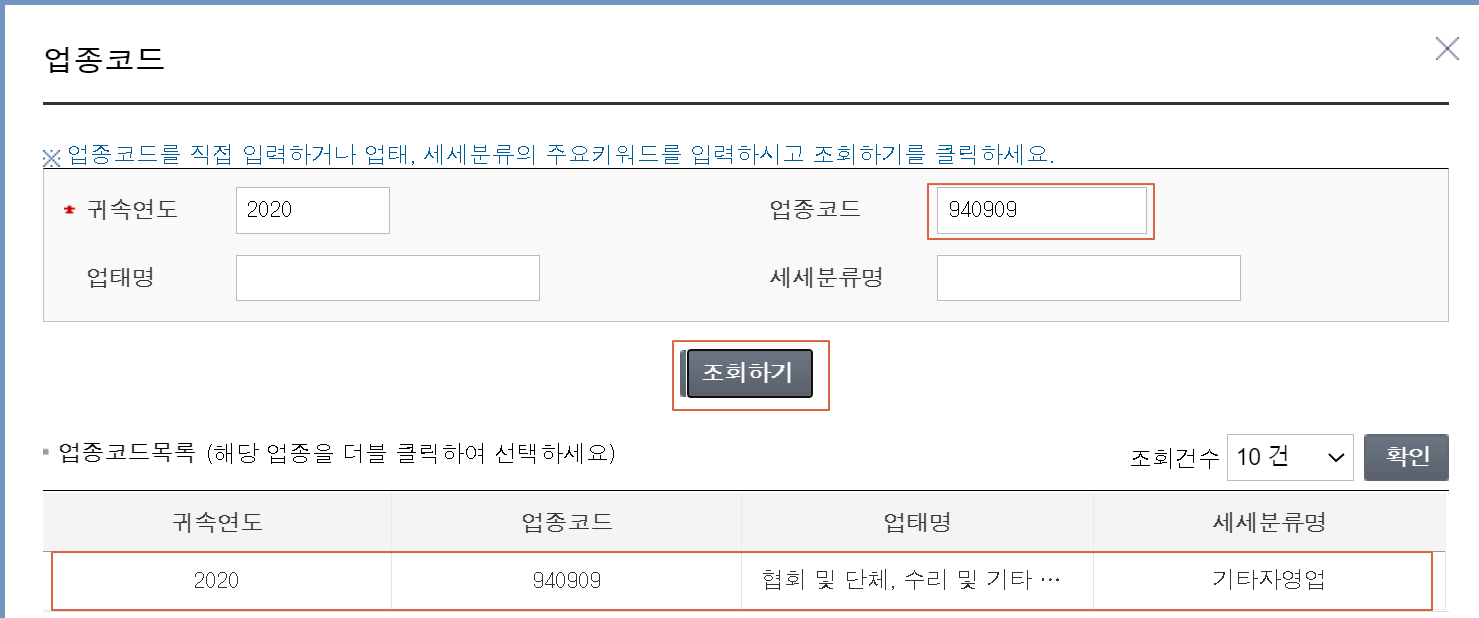9. 제가 위에서 알려드린 덕분에 종합소득세 업종코드를 몰라요 라고 말하는 분은 없으리라 생각합니다. 사업자등록번호 조회하고 주업종코드를 이렇게 입력하고 조회해서 선택하면 됩니다. 자동으로 들어간 분들도 있으니 안들어간 경우에만 수동으로 하세요.