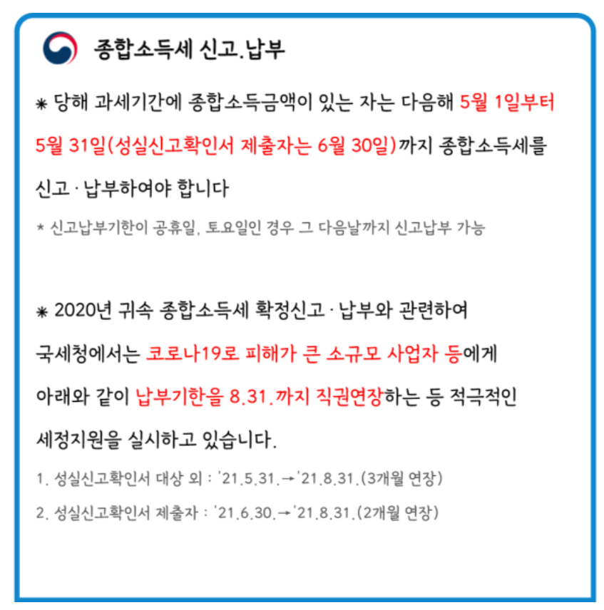 참고로 2020년 귀속 확정신고 납부와 관련해서 국세청에서는 코로나19로 피해가 큰 소규모 사업자 등에게는 납부기한을 8월 31일까지 직권으로 연장하는 등 세정지원을 실시한다고 합니다. 그렇다고 아예 안받는다는건 아닌 공지이므로 오해는 없으시길 바랍니다.