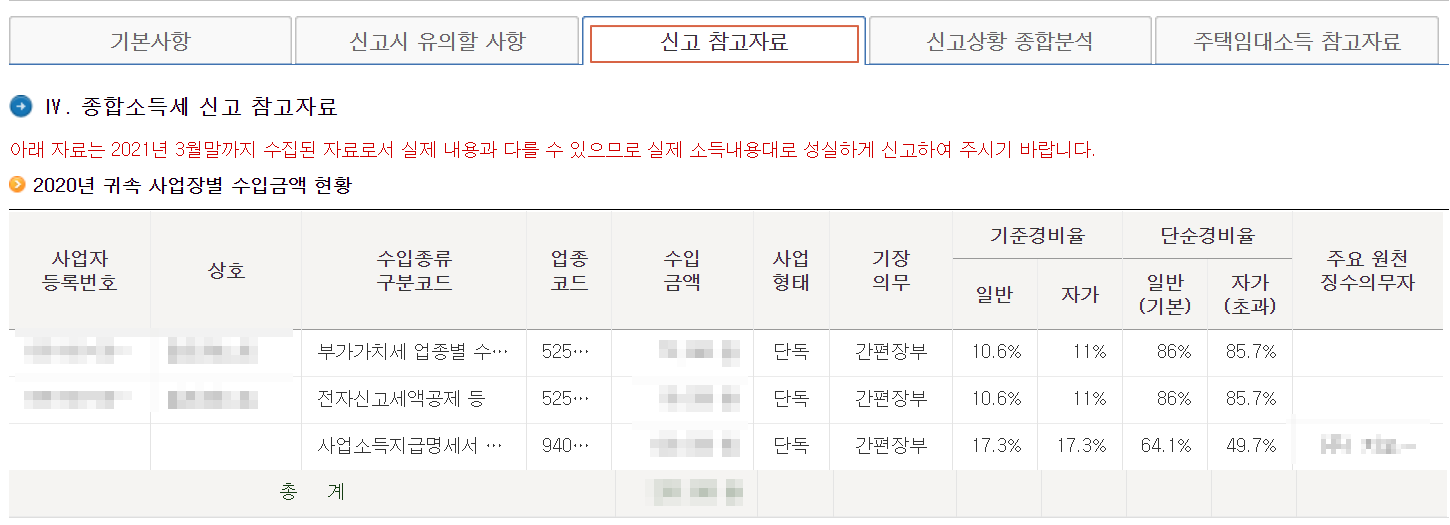 5. 저는 2020년 귀속 사업장별 수입금액이 얼마되질 않습니다. 기장의무가 전부 간편이란걸 알 수 있죠.