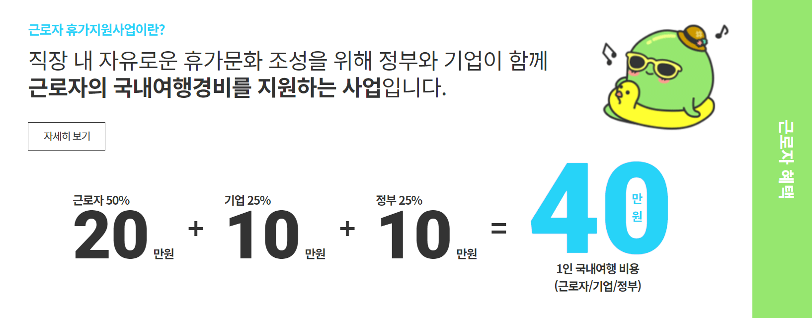 직장 안의 자유로운 휴가문화를 조성하고자 정부와 기업이 함께 근로자의 국내여행경비를 지원한다는 캠페인 입니다. 직장에서는 이상하게 본인의 권리라 할 수 있는 휴가도 눈치보면서 사용하기 힘든 경우가 많죠. 근로자가 20만원을 내고 기업이 10만원을 대고 정부가 나머지 10만원을 주는 개념입니다.