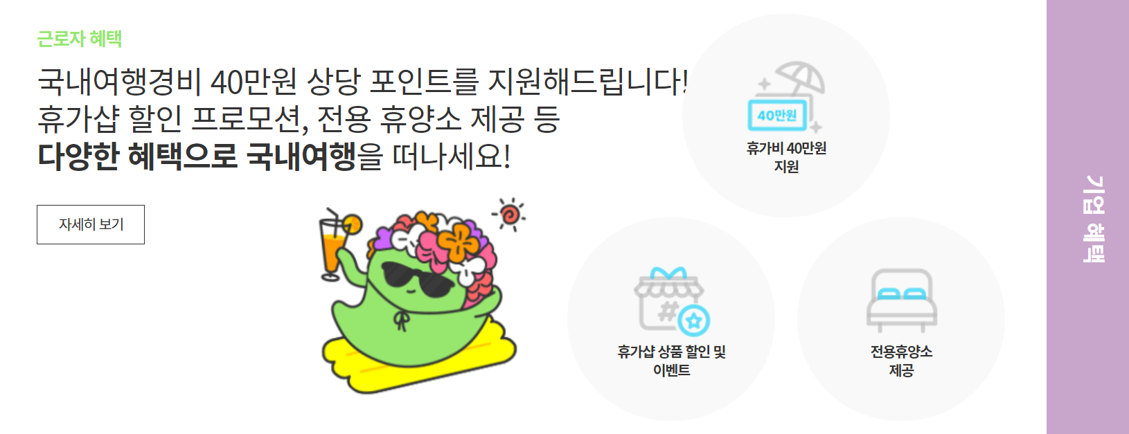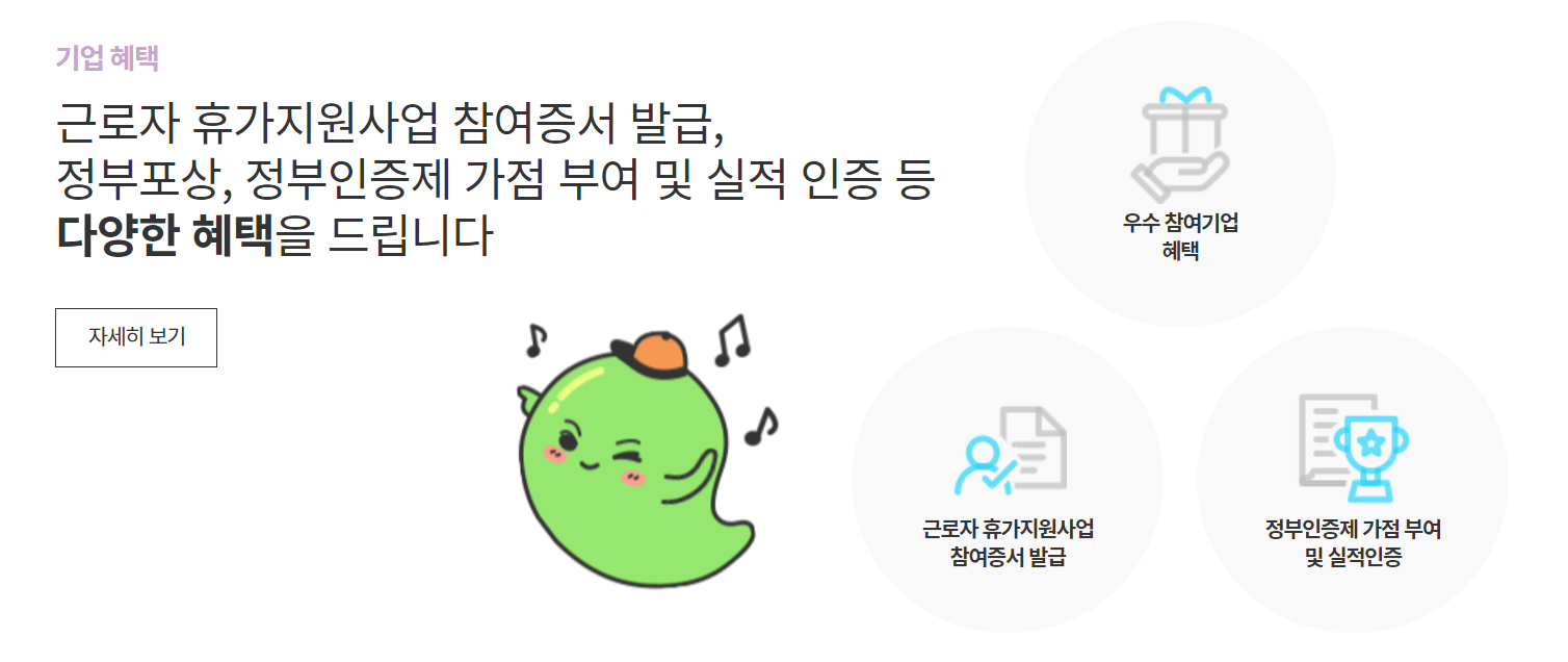 회사 입장에서는 우수 참여기업 혜택이 주어집니다. 근로자 휴가지원사업에 동참했다는 참여증서를 발급하구요. 정부포상 및 정부인증제 가점 부여 및 실적 인증 또한 받을 수 있습니다. 이게 얼마나 좋을 지는 해보신 분들만 알겠죠?