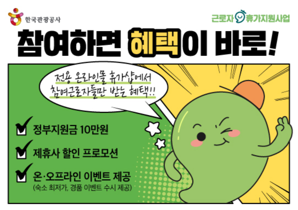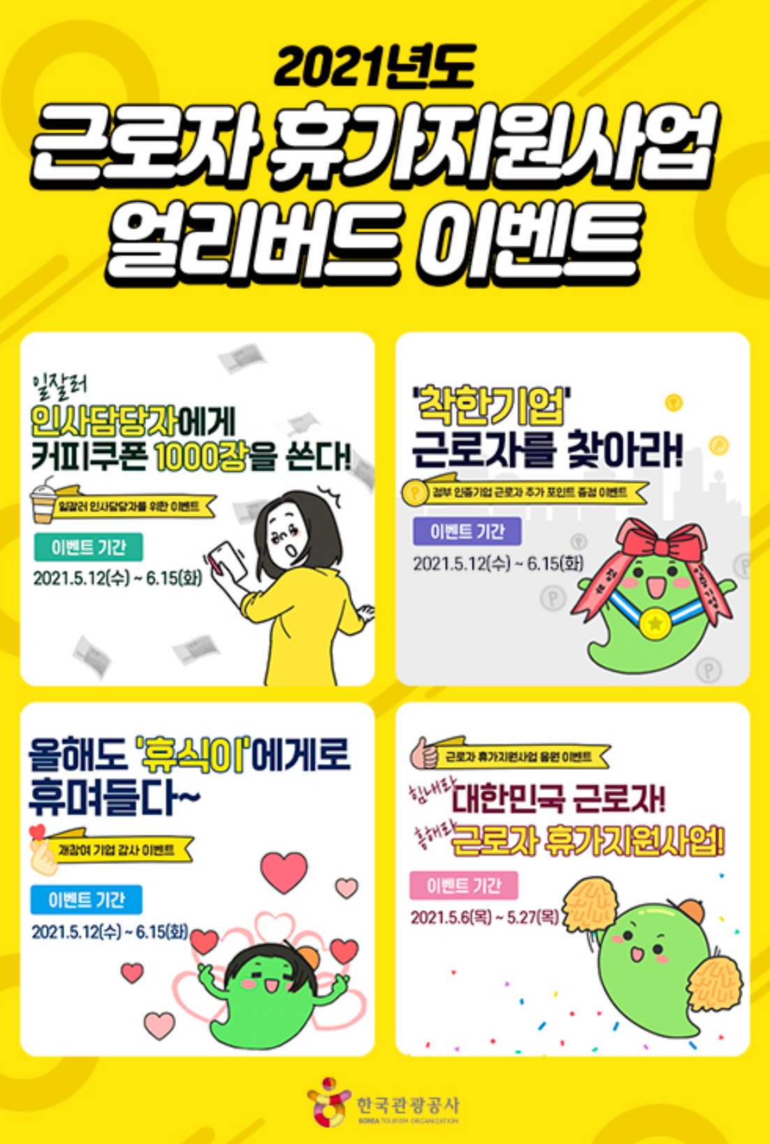 귀여운 유령처럼 생긴 녹색 캐릭터가 올해도 휴식하라고 알려주고 있습니다. 대한민국 근로자를 위한 휴가지원사업에 대한 내용도 있고 착한 기업을 찾기도 하죠? 한국관광공사에서 주최하고 진행하는 행사입니다.