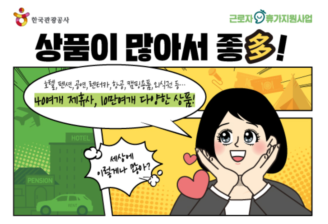여행, 숙박, 체험, 레저 입장권을 비롯해, 렌터카나 기차, 항공권 및 전시화와 공연관람까지 안되는 게 없다고 할 정도로 다 됩니다. 내가 20만원을 내면 40만원을 사용할 수 놀라운 기적이 일어납니다. 이것이야 말로 합법적인 재테크라 할 수 있죠.