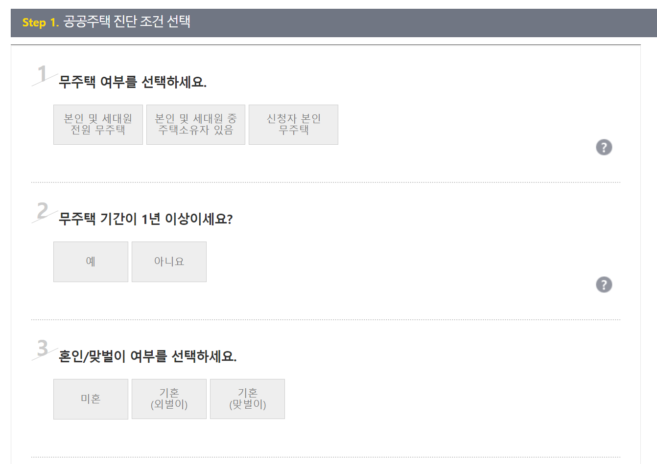 3. 무주택인 분들을 대상으로 하다보니 기본질문 또한 이런 맥락하에 이뤄지는 걸 알 수 있습니다. 1년 넘게 내집 없이 살고 있는 지와 혼인/맞벌이 여부를 선택합니다.