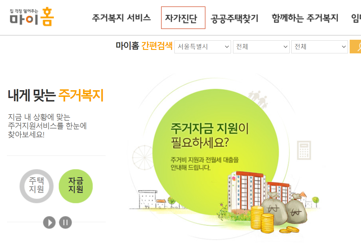1. 설명드린 대로 따라오셨다면 집 걱정 덜어주는 마이홈을 만나게 됩니다. 상단 메뉴 중 2번째 위치한 '자가진단'을 선택합니다. 이리로 들어가면 보다 구체적인 과정을 진행해볼 수 있거든요.