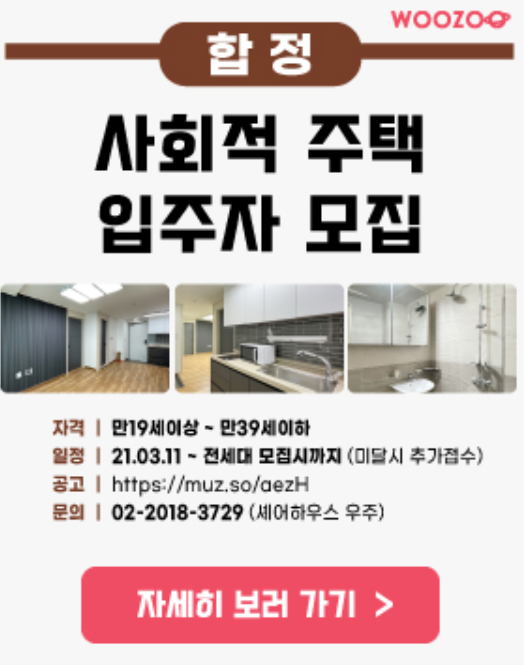 합정 쪽에선 만 19세 이상 ~ 39세 이하의 사회적 주택 입주자를 모집 중임을 알 수 있습니다. 셰어하우스라니 별 게 다 생기네요. 사진으로 보는 집 컨디션은 나쁘지 않아 보입니다. 하지만 막상 살아보는 것과 아닌 것은 큰 차이가 있죠. 제가 여러 집을 이사다니면서 살아보니 느껴지더군요.
