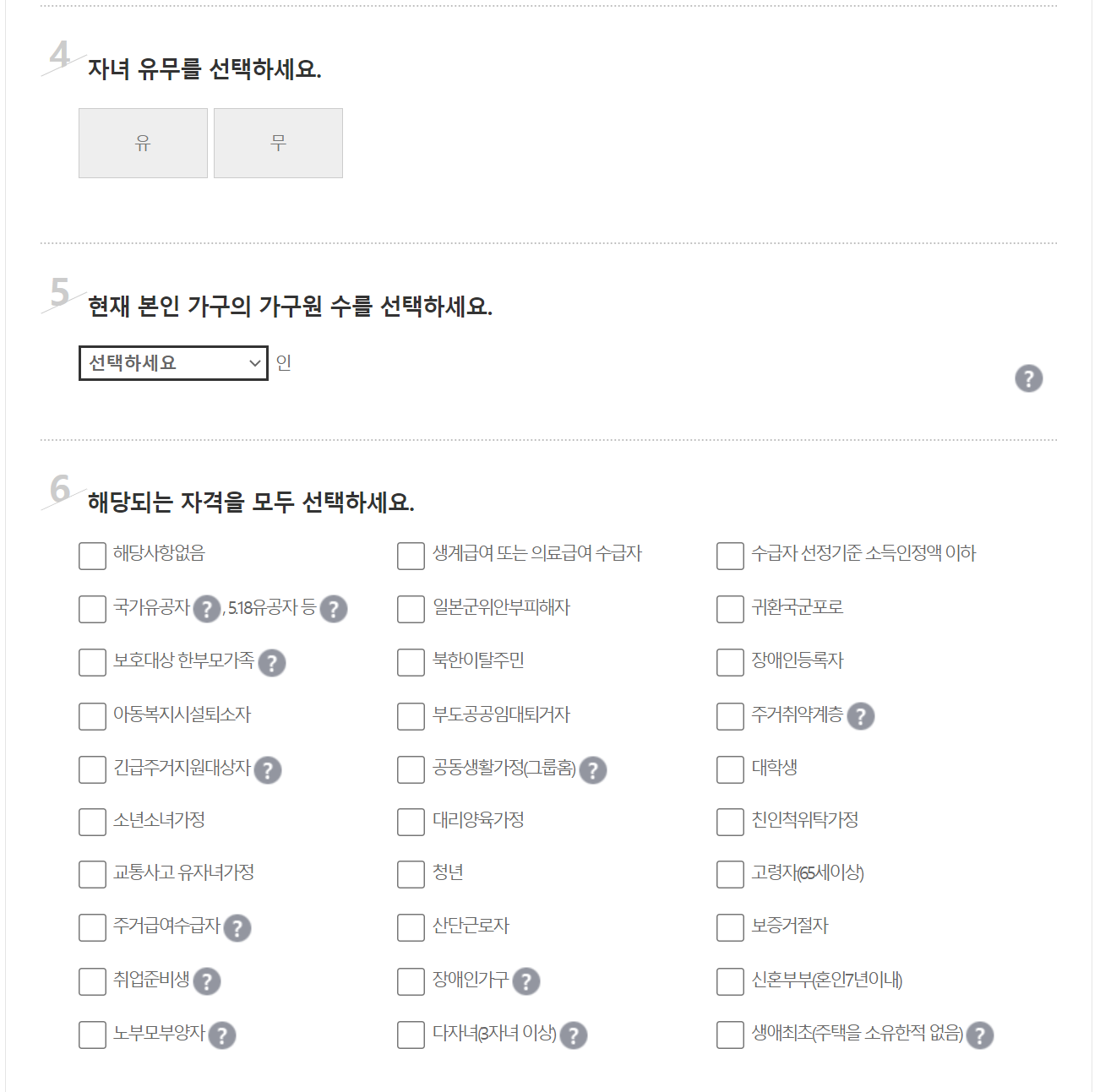 4. 자녀를 포함한 본인 가구의 가구원 수를 선택하고 국가유공자 인지 한부모가정인지 소년소녀인지 탈북민인지 주거 취야계층 등을 선택합니다. 한가지만 고를 수 있는게 아니니 편하게 여러 항목을 체크하세요.